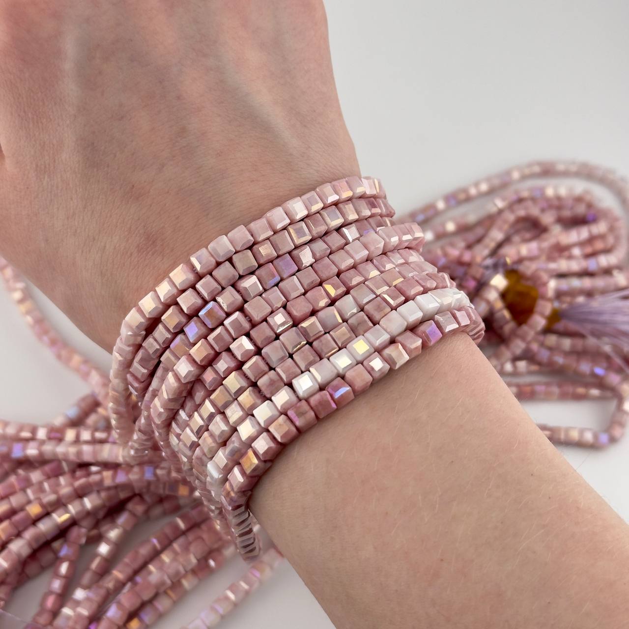 Дочка любит рукодельничать, постоянно делает браслеты, ожерелья, бусы и брошки. Стеклянные бусины в форме кубика не единственный товар, который я приобретала в этом магазине. Но они особенно понравились, своим перламутровым цветом и оригинальной формой. Бусы получились превосходные, даже я иногда одеваю на праздник. Стекло не хрупкое, довольно прочное. Все отверстия одинаковые и легко нанизываются на нитку или леску. Рекомендую данный магазин к покупкам товаров для рукоделия.
